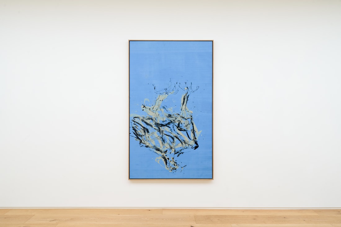 Perched in front of this blue, delineated in two to three colours, always including black, the eagles convey a sense of the vigour with which they were painted. Baselitz uses spatulas rather than paint brushes, producing marks that recall middle and late period Rembrandt and, even more so, pen and ink drawings by Hokusai. ‘In Baselitz’s pictures the eagles are fully awake, as if electrified by painting that is wholly present, as if the bird had only just, in this very moment, materialised on the canvas [...] Filigree and powerful at once: a typical Baselitz paradox.’ writes Andreas Zimmermann, curator of the celebrated exhibition Georg Baselitz: Naked Masters (2023) at the Kunsthistorisches Museum, Vienna, in the catalogue accompanying this exhibition.