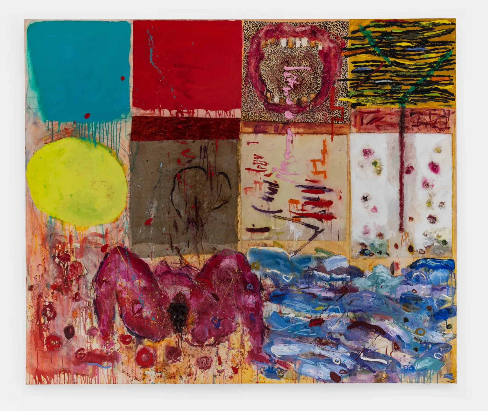 Oil, acrylic, fabric, paper mache, glitter, straw and plastic grapes on canvas