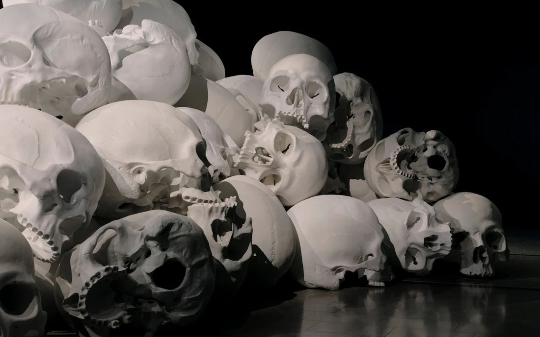 While this bit of the process involves a team of technicians, for the most part Mueck works alone in his studio on the Isle of Wight. For Mass – first shown in Australia in 2017 – he carved a prototype skull from clay, which was subsequently cast. Then, individual details such as shattered nasal cavities or ruptured ear sockets were added to each skull. “We’ve been very careful to ensure that they have no gender, you don’t know what age the person might have been, what ethnicity, whether they are ancient skulls or modern people,” says Clarke. “Each skull could belong to anyone.”