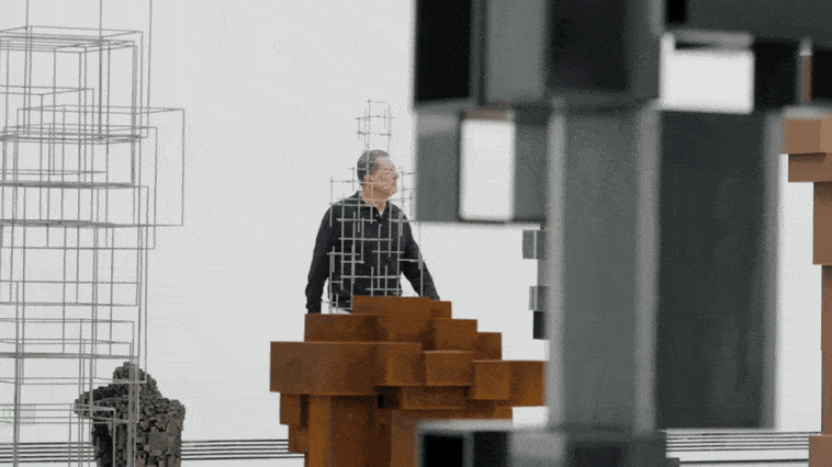 “作品《聚集I》是我第一次意识到,我可以用元素,从部分到整体去构筑空间。你可以看到这些钢块它们是相当粗糙的,还有焊接的烟熏在上面。”