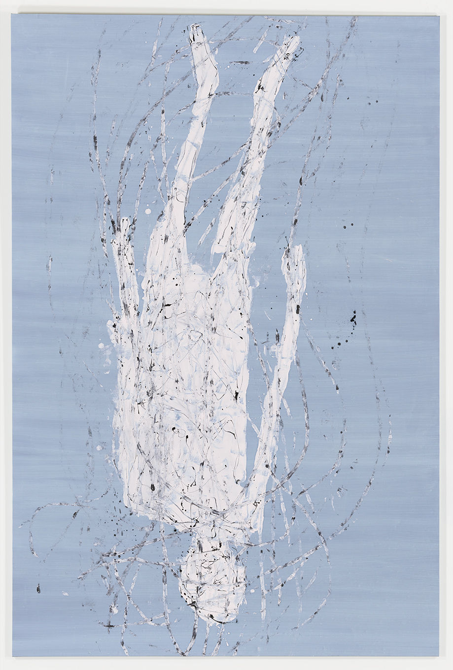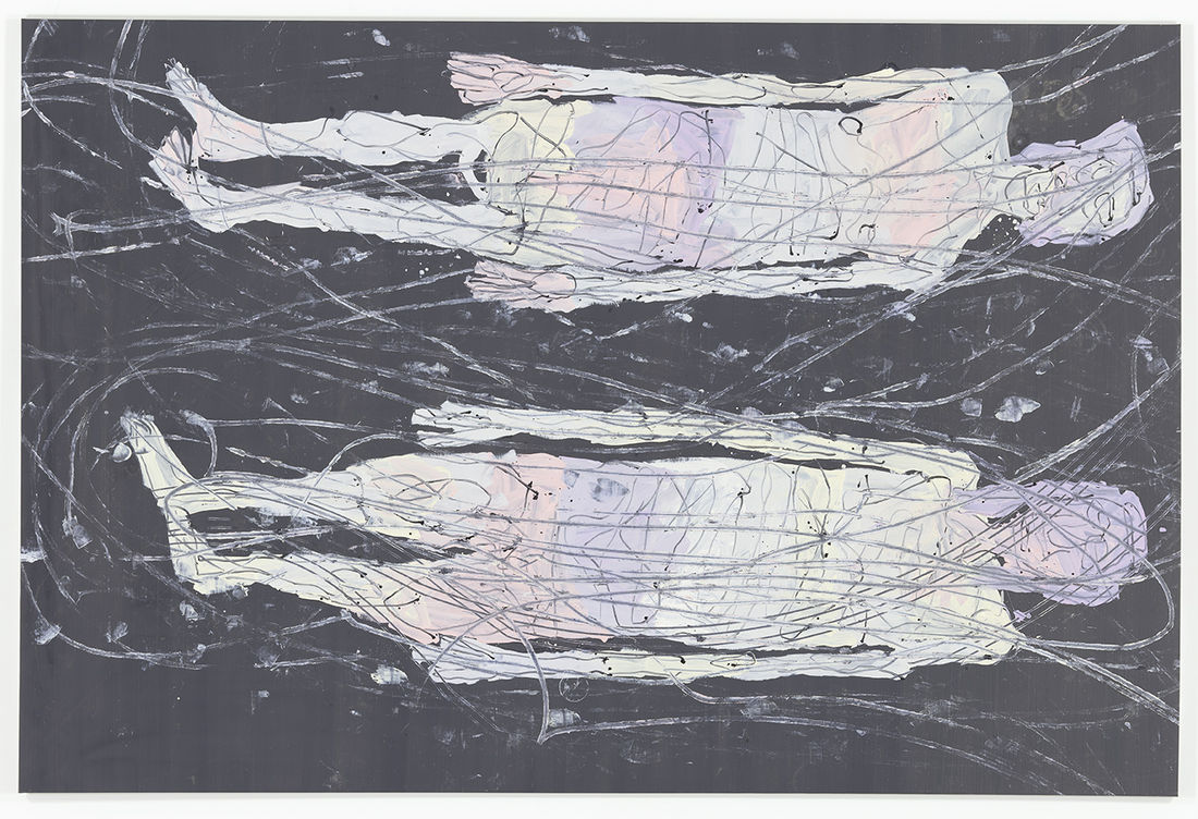 Using a walker, Baselitz carves wheel marks into the fresh paint and rolls over his pink, beige, or apricot-colored bodies. Footprints and drops of paint also appear in the paintings, which are mostly black, but also have grass-green or Picasso-blue grounds. The dance of the lines around the bodies, but also through them, gives rise to conflicting emotions.