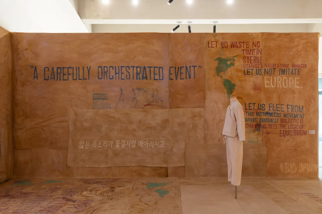 The title For Theresa invokes the legacy of the late Korean-American artist Theresa Hak Kyung Cha (1951–1982). El-Sayegh draws parallels between her own artistic world and Cha’s seminal work, Dictee, exploring shared themes of fragmented subjectivity, the displacement of memory, and linguistic stratification. In doing so, she constructs a stage that reconfigures the female voice within contemporary discourse. Designed specifically for the architecture of Space K Seoul, the site-specific installation compels a physical passage, encouraging a state of deep immersion and collective solidarity that transcends mere observation. Within this landscape where horizons are built from dislocated remnants, we are invited to find the politically transformative possibilities of the poetic.