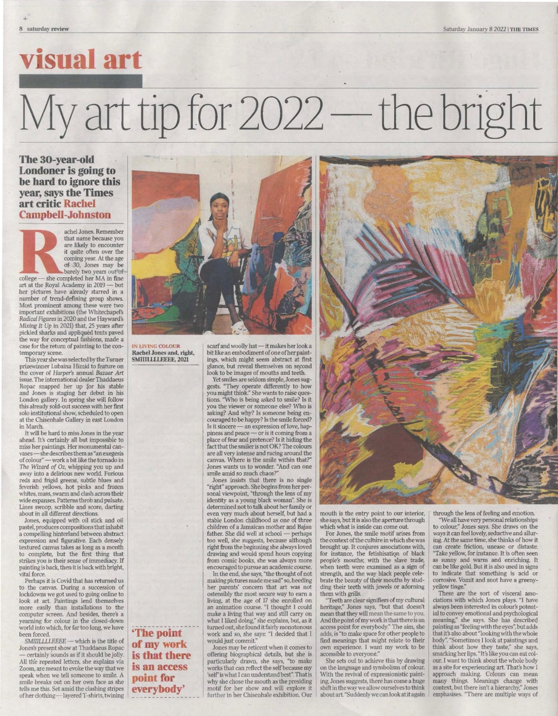 Yet smiles are seldom simple, Jones suggests. “They operate differently to how you might think.” She wants to raise questions. “Who is being asked to smile? Is it you the viewer or someone else? Who is asking? And why? Is someone being encouraged to be happy? Is the smile forced? Is it sincere — an expression of love, happiness and peace — or is it coming from a place of fear and pretence? Is it hiding the fact that the smiler is not OK? The colours are all very intense and racing around the canvas. Where is the smile within that?” Jones wants us to wonder. “And can one smile amid so much chaos?”
