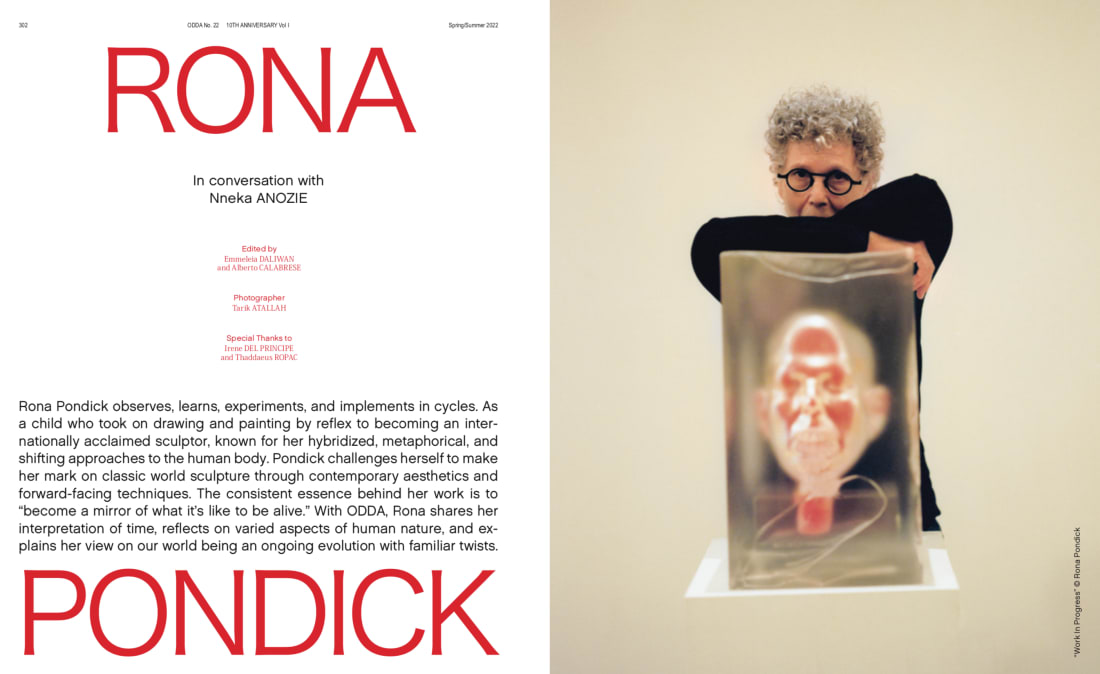 Rona Pondick observes, learns, experiments, and implements in cycles. As a child who took on drawing and painting by reflex to becoming an internationally acclaimed sculptor, known for her hybridized, metaphorical, and shifting approaches to the human body. Pondick challenges herself to make her mark on classic world sculpture through contemporary aesthetics and forward-facing techniques. The consistent essence behind her work is to “become a mirror of what it’s like to be alive.” With ODDA, Rona shares her interpretation of time, reflects on varied aspects of human nature, and explains her view on our world being an ongoign evolution with familiar twists.