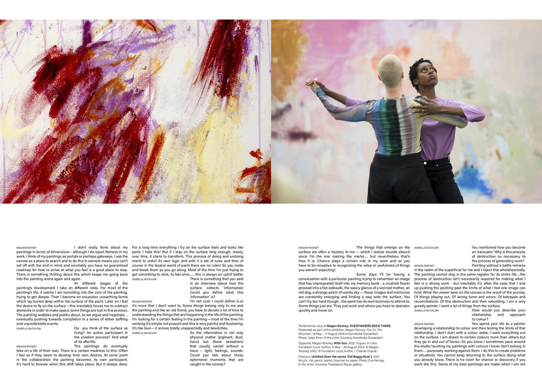 Mural comes from the French ‘mur’ for wall. For artist Megan Rooney a wall is not a dead dumb surface, rather she is attentive to their inexhaustible hum; the liveliness of walls. Her art is deeply enmeshed with place, where colour and gesture fuse into site and surface. These surfaces, often vast canvases or walls, both taunt and yield to Rooney’s interrogative mark-making. Rooney works between performance, painting and architecture, disciplines that converge in the method and form of the mural. Rooney’s murals murmur and throb, hot with colour and memory. The Canadian artist has been based in Europe for most of her career, garnering solo shows at Salzburger Kunstverein, Kunsthalle Düsseldorf and SALTS in Kassel, as well inclusion in the Lyon Biennial and group show at the Palais de Tokyo. We spoke with Megan about her most recent work, about dreaming in blue and being a greedy painter.
