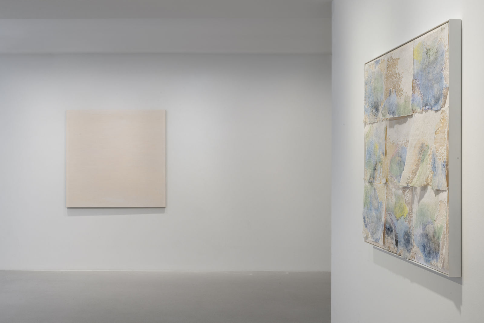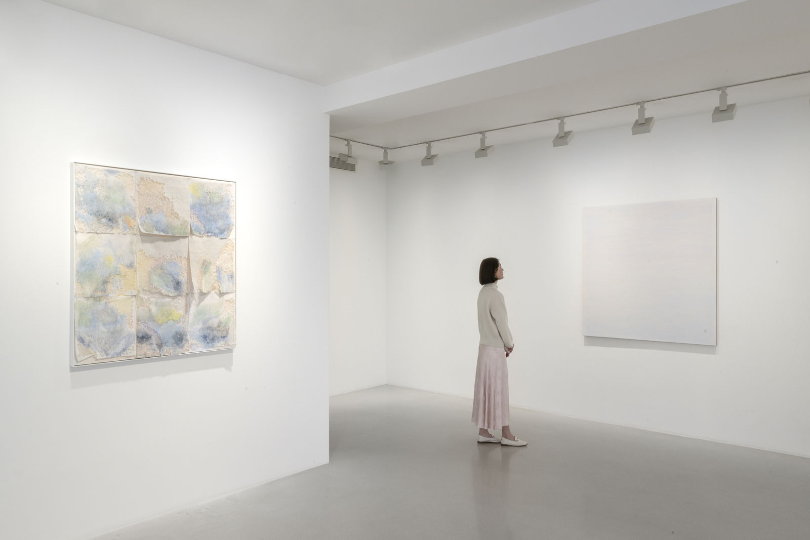 in, is, possible, each day… Lou has named each of the paintings after a singular preposition, adjective, or temporal signifier. The titles cement Lou’s contemplative approach to this body of work. They point to an almost transcendental philosophy of mark-making, tracing a connection back through a feminist engagement with Minimalism to the work of early 20th-century painters such as Hilma af Klint, for whom painting was a spiritual act in itself, rather than simply a means towards the realisation of an idea.