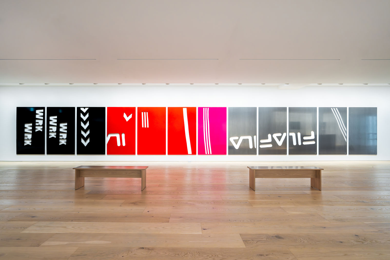 아크앤젤은 지난 15년간 레저 의류에서 보이는 이미지나 도상들을 자신의 작품 전반에 활용함으로써, 상품과 이미지가 세계적으로 유통되는 방식에 대해 연구해왔다. ⟨알루스(Alus)⟩(2022-23)는 작가가 최근 몰두하고 있는 연작으로, 레이저 로봇 절단기를 사용하여 얇은 알루미늄 패널에 추상적인 모양을 오려내는 방식으로 제작된다.