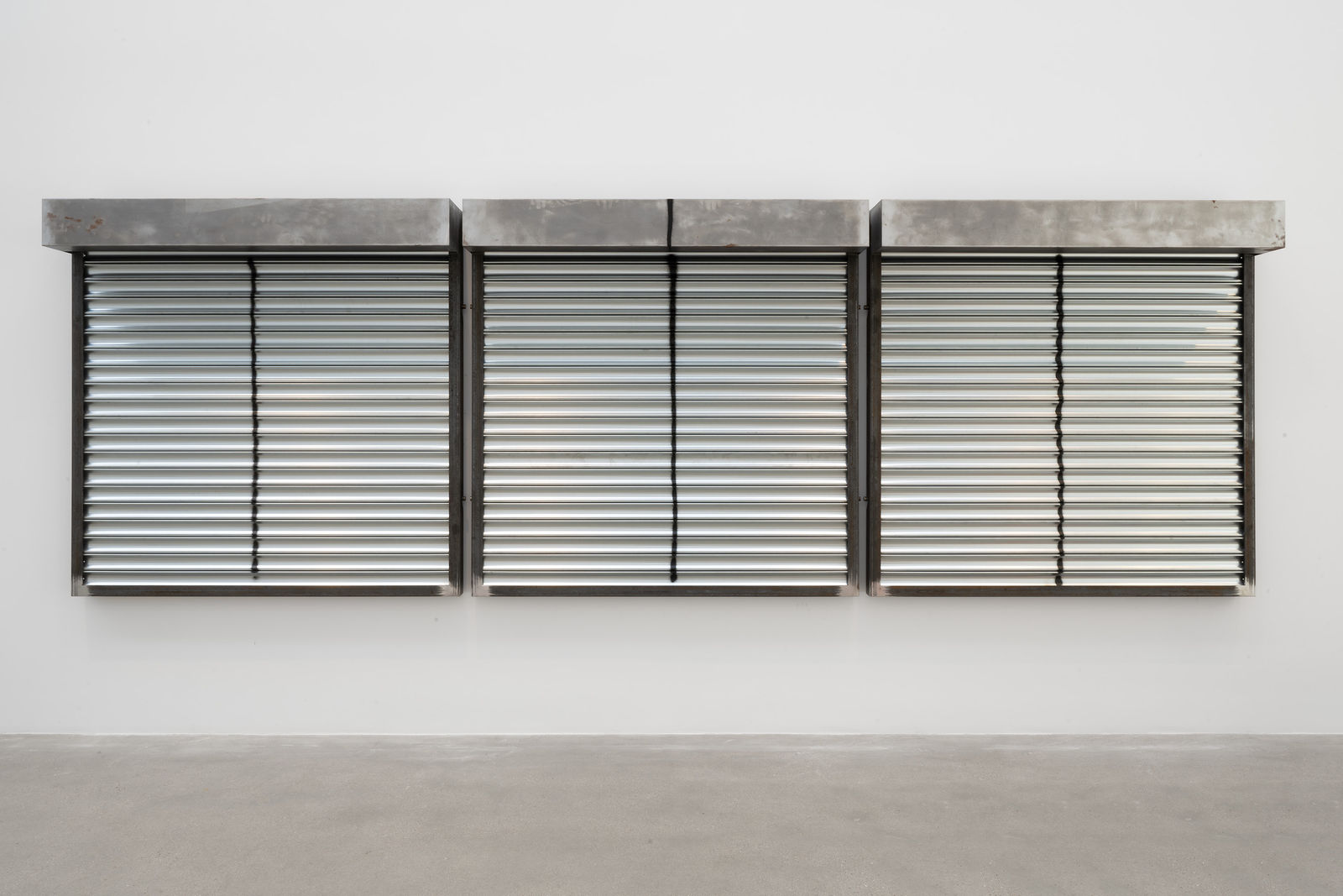 Each of the closed metal shutters represents one of the figures in Piero della Francesca’s mid-15th century The Baptism of Christ: the two shutters that stand alone are Jesus Christ and John the Baptist, while the three shutters grouped together represent the three saints or angels. The shutters are also landscape paintings, Barrington explains: he relates them to the tradition of American landscape painting and particularly to Mark Rothko, with the horizontal rectangular forms created by the slats of Barrington’s shutters recalling the horizontal areas of paint in Rothko’s colour field paintings.