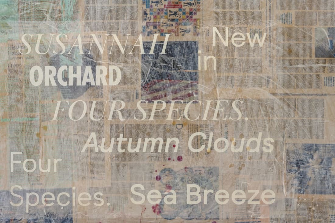 Over this base, the artist applies a gestural wash of white paint, forming a semi-transparent ‘veil’ that holds together the fragments of image and text.