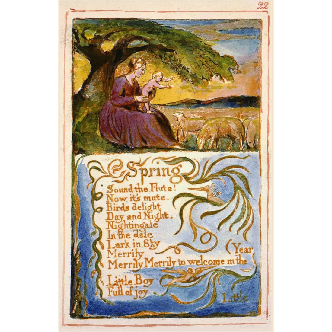 1. Detail of Figured Ground, 2021. Silkscreened ink, newspaper, latex and mixed media. Dimensions variable. 2. William Blake, ‘Spring’, In Songs of Innocence and of Experience, 1974. 3. Detail of Little fly (Stephen), 2021. Oil and mixed media on silkscreened linen with collaged elements. 218 x 138 cm (85.83 x 54.33 in).