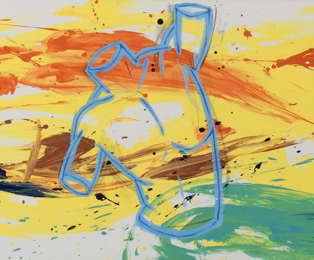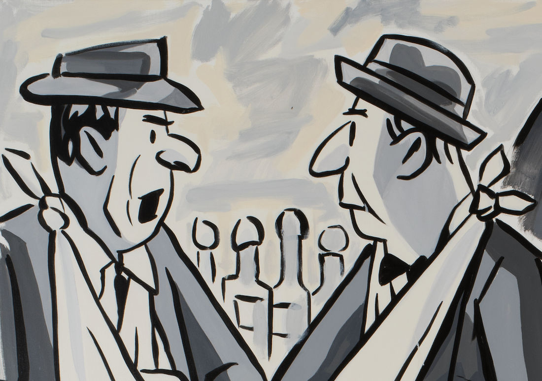 Viewers are encouraged to identify with stylised black-and-white figures of men and women acting out a silent human comedy in the upper part of the paintings. These are drawn from mid-century New Yorker covers by Peter Arno, whom Salle admires for his ‘ability to sell a gesture or a situation with very few brushstrokes.’ The cartoons came to define New York society from the first year of the magazine’s publication in 1925 until Arno’s death in 1968.