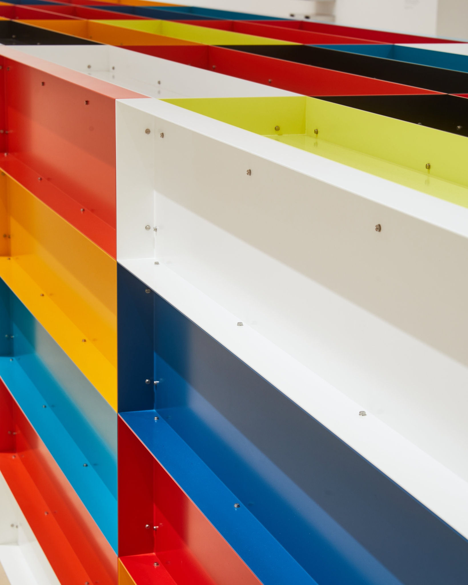 It is the art produced by this combination of authorial presence and absence that makes up the bulk of a retrospective — organized by Ann Temkin, MoMA’s chief curator of painting and sculpture, with Yasmil Raymond, former associate curator; Tamar Margalit, a curatorial assistant; and Erica Cooke, a research fellow — that spans more than 30 years. In the second gallery, where industrial fabrication starts, we get a full range of what will be repeated Judd forms. There are round-ended metal wall pieces shaped like bolster pillows, and sets of thin, squared-off uprights reminiscent of high-jump bars. The little 1963 shelf-and-tube piece reappears in larger, more elaborate versions, its horizontal air shaft intact. And there are boxes, many, open and closed, foursquare and flat, single or multiple, floor-bound or attached to the wall and stacked up, one over the other, high.