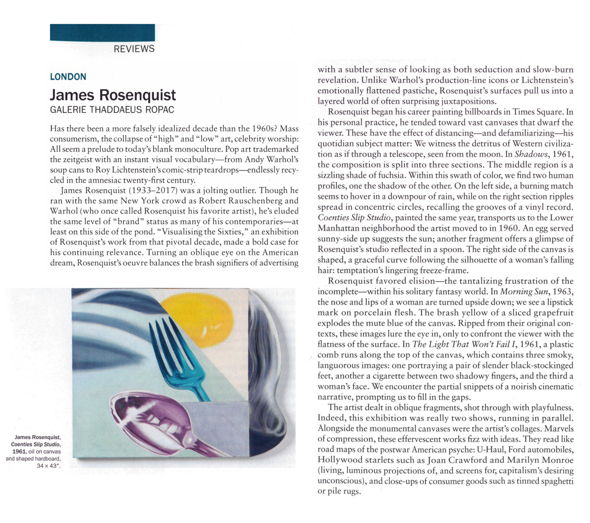 James Rosenquist (1933–2017) was a jolting outlier. Though he ran with the same New York crowd as Robert Rauschenberg and Warhol (who once called Rosenquist his favorite artist), he’s eluded the same level of “brand” status as many of his contemporaries—at least on this side of the pond. “Visualising the Sixties,” an exhibition of Rosenquist’s work from that pivotal decade, made a bold case for his continuing relevance. Turning an oblique eye on the American dream, Rosenquist’s oeuvre balances the brash signifiers of advertising with a subtler sense of looking as both seduction and slow-burn revelation. Unlike Warhol’s production-line icons or Lichtenstein’s emotionally flattened pastiche, Rosenquist’s surfaces pull us into a layered world of often surprising juxtapositions.