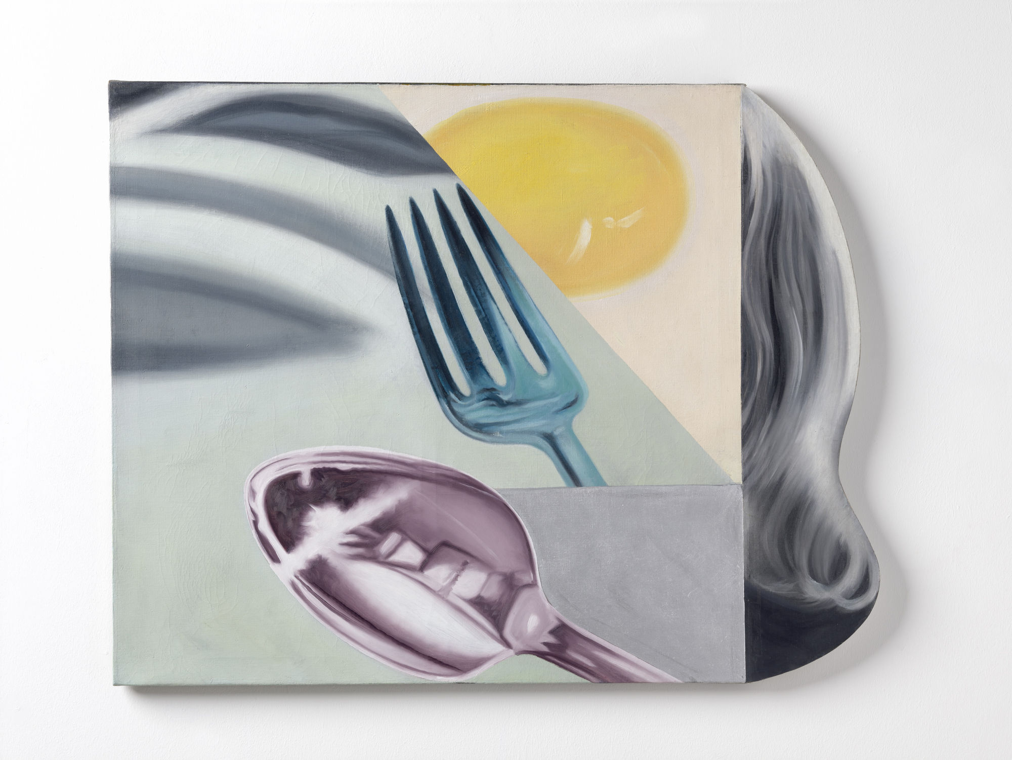 Rosenquist began his career painting billboards in Times Square. In his personal practice, he tended toward vast canvases that dwarf the viewer. These have the effect of distancing—and defamiliarizing—his quotidian subject matter: We witness the detritus of Western civilization as if through a telescope, seen from the moon. In Shadows, 1961, the composition is split into three sections. The middle region is a sizzling shade of fuchsia. Within this swath of color, we find two human profiles, one the shadow of the other. On the left side, a burning match seems to hover in a downpour of rain, while on the right section ripples spread in concentric circles, recalling the grooves of a vinyl record. Coenties Slip Studio, painted the same year, transports us to the Lower Manhattan neighborhood the artist moved to in 1960. An egg served sunny-side up suggests the sun; another fragment offers a glimpse of Rosenquist’s studio reflected in a spoon. The right side of the canvas is shaped, a graceful curve following the silhouette of a woman’s falling hair: temptation’s lingering freeze-frame.